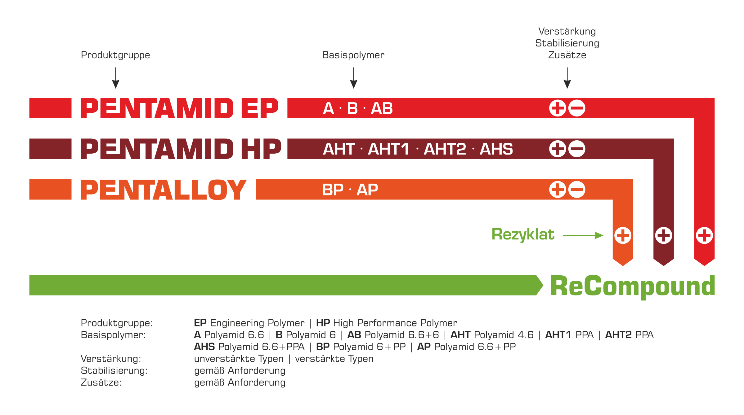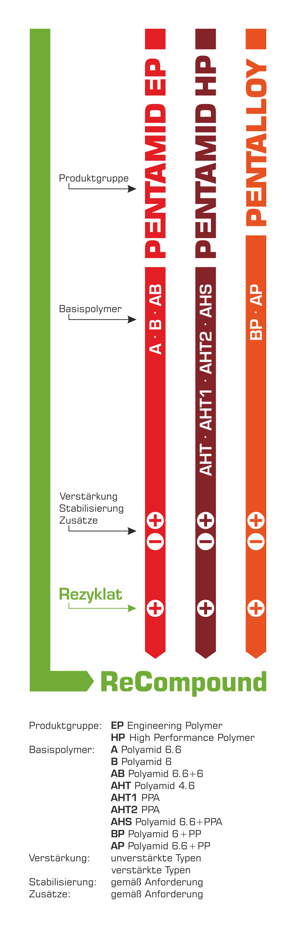 PENTAC Polymer bietet ein breit aufgestelltes nachhaltiges und umweltschonendes Produktsortiment im Bereich der ReCompounds. Die ReCompounds basieren dabei auf den wertvollen postindustriellen Rezyklaten als Basispolymer, wie PA-6, PA-6.6, PA-6.6+6, PA-4.6, PPA, PA-6.6+PPA, PA-6+ABS, PA-6+PP und PA-6.6+PP. Diese werden durch die Zugabe von Glasfaserverstärkungen, Stabilisierungen und dem gezielten Einsatz von Additiven in ihren Qualitätseigenschaften enorm gesteigert, sodass Eigenschaften von 1-A Waren erlangt werden.